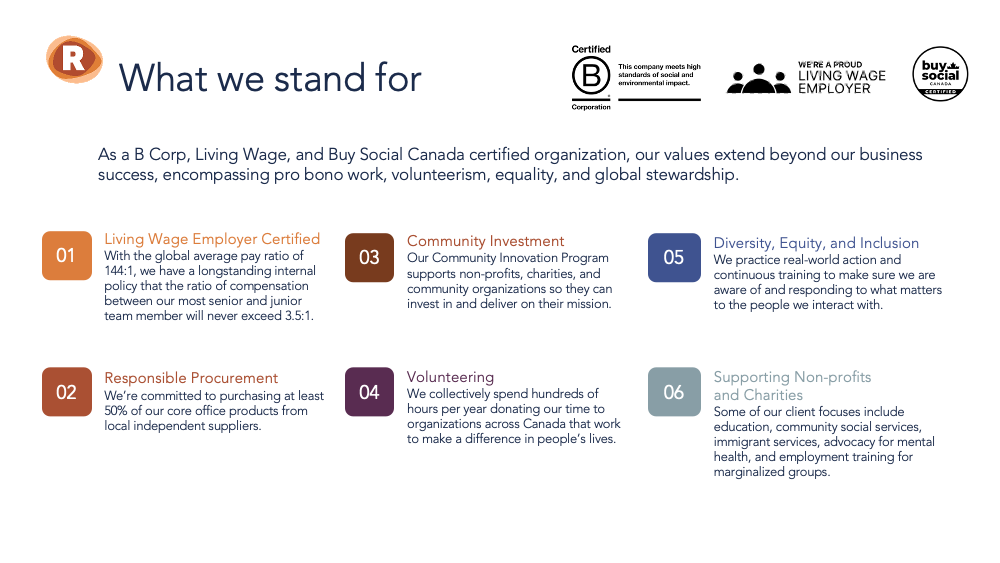 Our values extend beyond business success to encompass pro bono work, volunteerism, equality, and global stewardship. We’re proud to support clients across various sectors including education, community social services, immigrant services, advocacy for mental health, and employment training for marginalized groups.