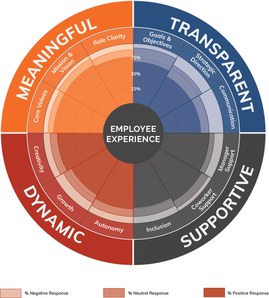 Growth in relation to the overall employee experience involves establishing a learning culture where mistakes are viewed as learning opportunities. This can start with leaders showing vulnerability by admitting to their own mistakes and creating spaces where others feel that it’s ok to share and learn from each other’s mistakes as well as ask for help without the fear of job loss. Employees also desire clarity on how they can grow and develop in their roles as well as how they can advance their careers. Having a strong Growth score within an organization can drive employee job satisfaction and also reduce job anxiety and burnout.