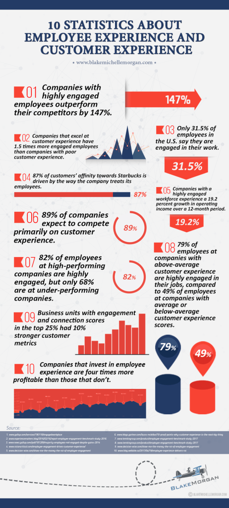 Research has shown that “companies that invest in employee experience are four times more profitable than those that don’t” and “79% of employees at companies with above-average customer experience are highly engaged in their jobs, compared to 49% of employees at companies with average or below-average customer experience scores.”